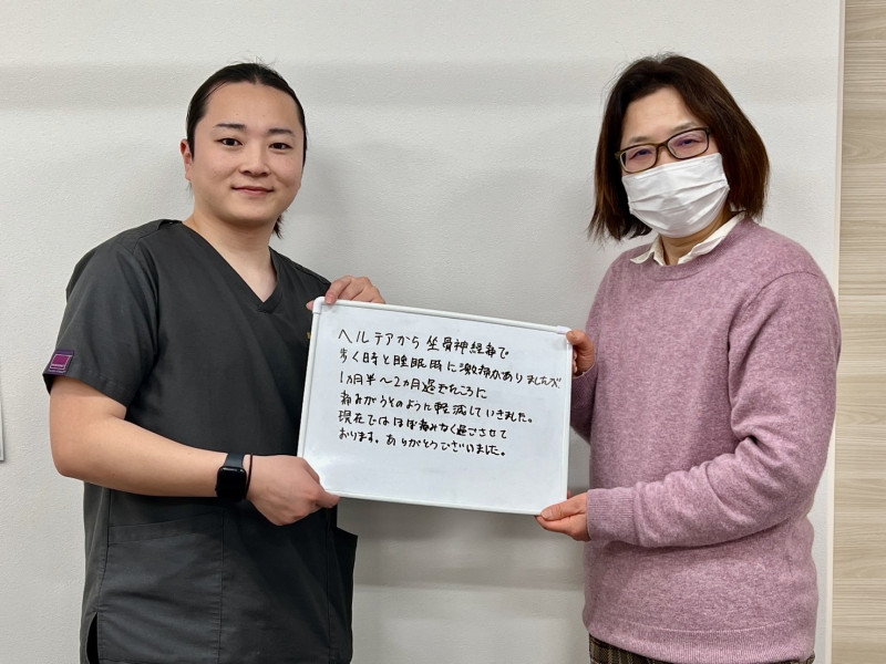 「太ももの痛みと足の痺れがあり、辛かったですが、改善されてとても楽になりました!」